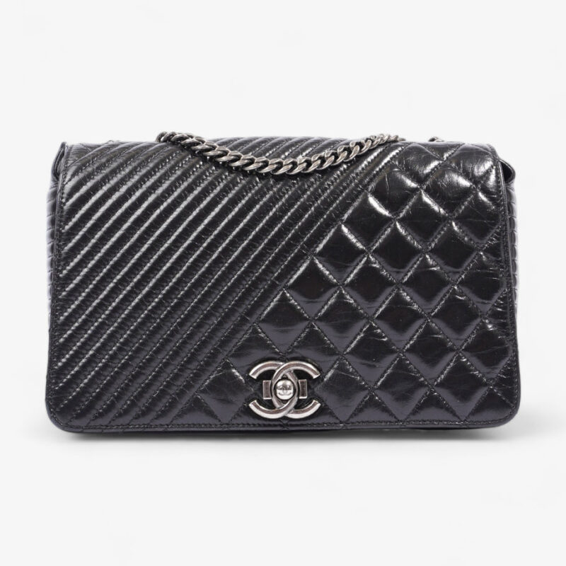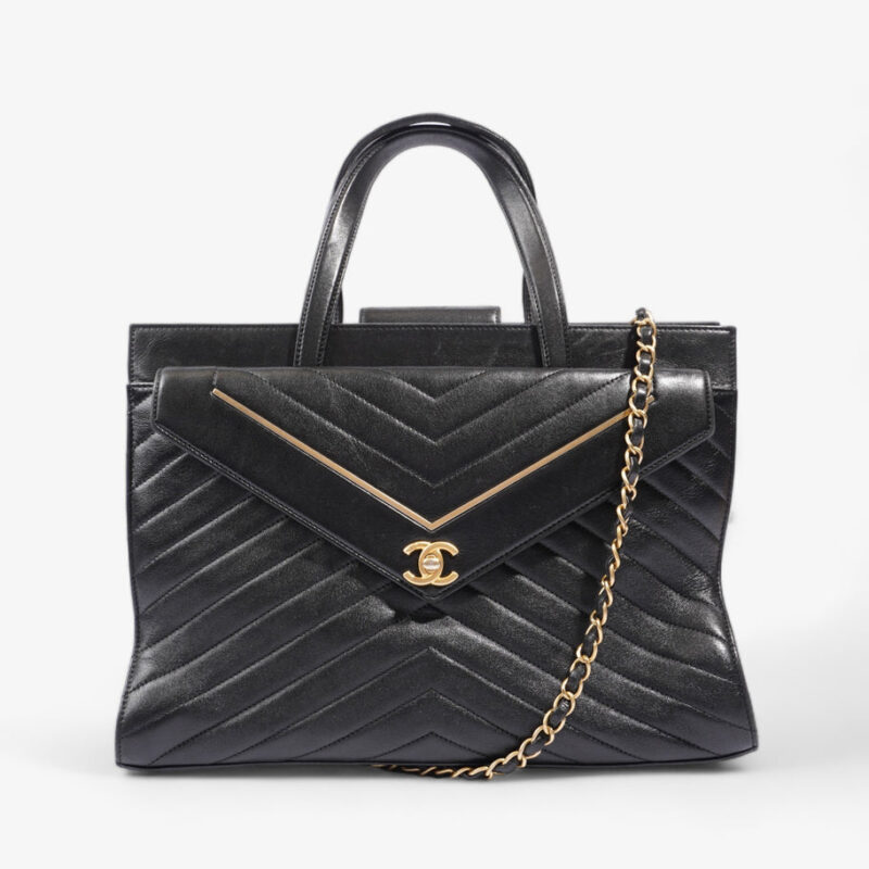 Chevron Quilted Tote Black Lambskin Leather Large