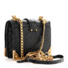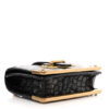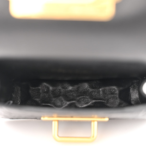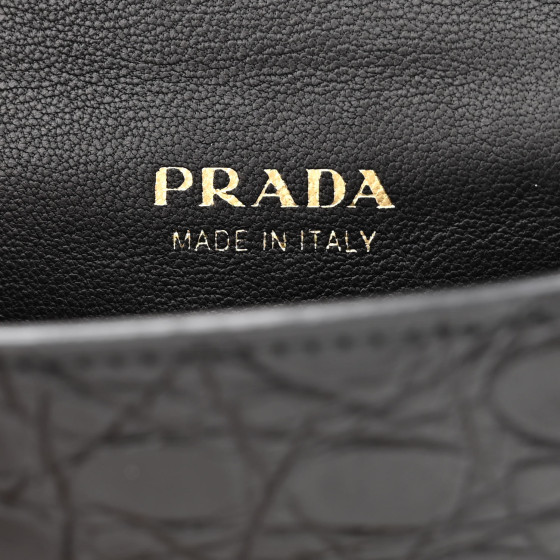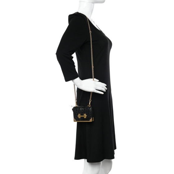 PRADA Velvet Crocodile Micro Cahier Bag in Black. This stylish one of a kind shoulder bag is crafted of crocodile embossed leather in black. The bag features aged brass hardware, a leather wristlet, an optional chain link shoulder strap. The bag opens with a crocodile cross over strap to a black leather interior.