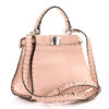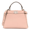 FENDI Cuoio Romano Selleria Mini Peekaboo Iconic Satchel in Cipria and Latte. This satchel is crafted of calfskin leather in light pink with prominent stitching. It features a sturdy matching top handle and optional shoulder strap, silver hardware including handle links and a top interior structured frame. The bag also features a silver turn lock on each side opening to a beige leather interior with a zipper and patch pocket.