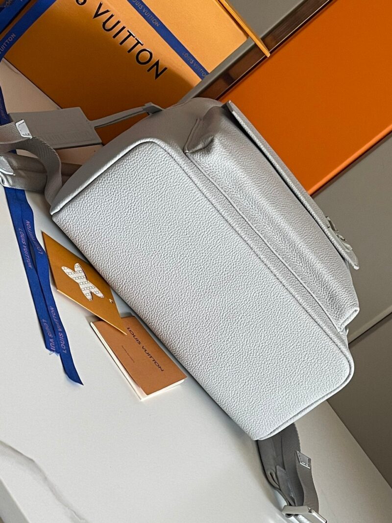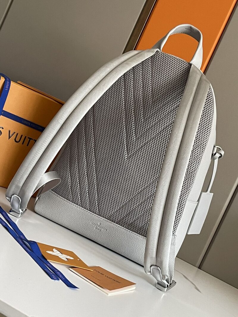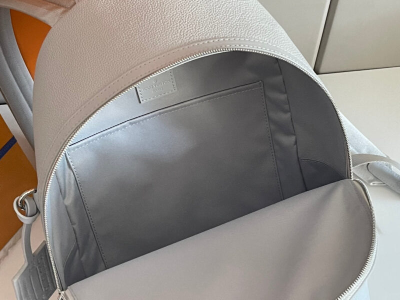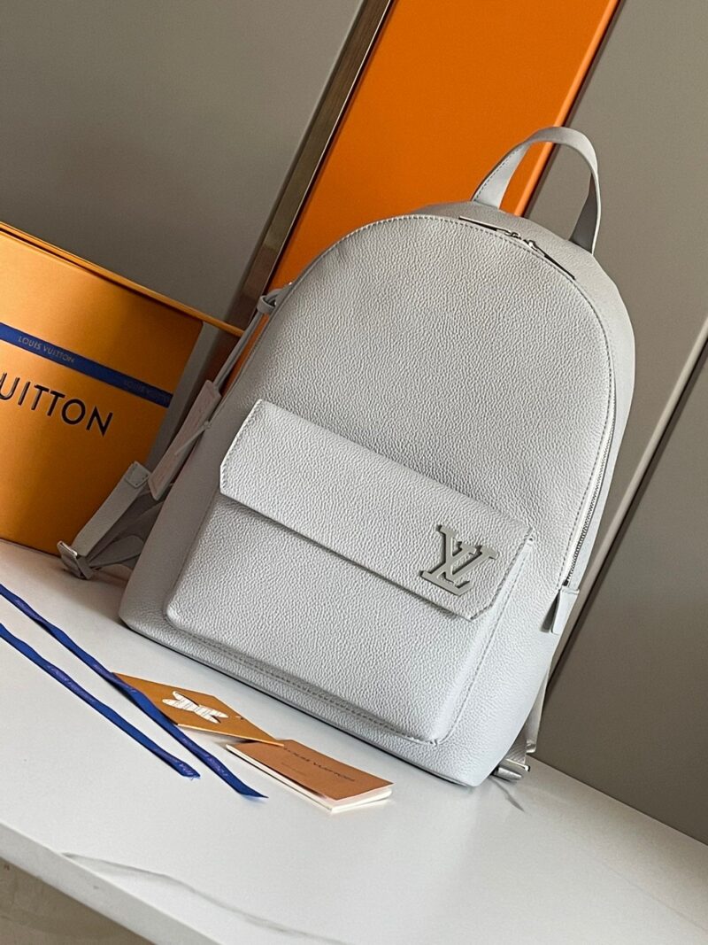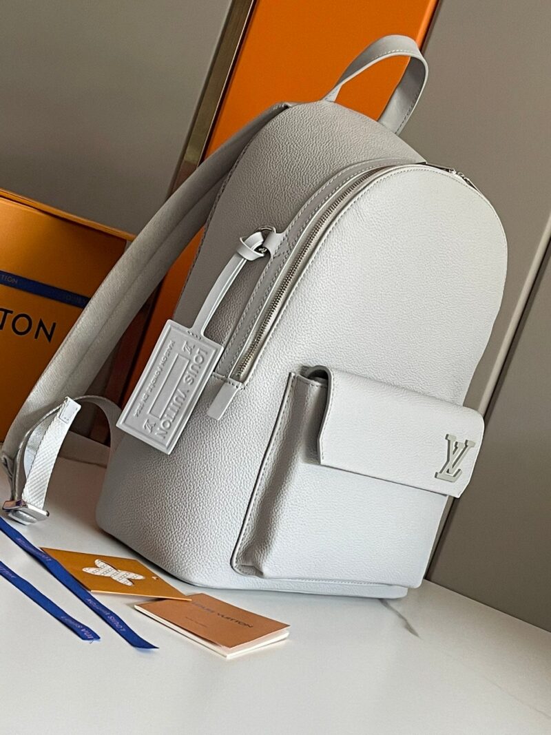 LV Aerogram backpack with innovative choices of elegant temperament. The delicate calfskin is like old airline stationery.43 x 30 x 14 cm length x height x width large grain calfskin side lined cowhide leather metal metal letter logo can customize label fabric shoulder strap flipper closure front bag with magnetic buckle single handle. American