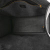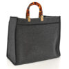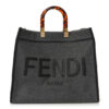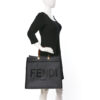 FENDI Melange Flannel Plexiglass Satin Logo Embroidered Threaded Edge Large Fendi Sunshine Shopper Tote in Grigio and Black. This stylish shopping tote is crafted of grey melange wool flannel with pick-stitch detailing and features PVC top handles, gold-tone hardware, and a bold, stitched calfskin Fendi logo. The top opens to a spacious interior. The interior features the Fendi FF motif against a light grey background.