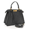 FENDI Melange Flannel Satin Threaded Edge Medium Peekaboo I SEE U Satchel in Grigio and Bois de Rose. This stylish tote is crafted of grey woven flannel. This bag features a top handle, an optional shoulder strap, and a structured frame across the top secured by a turn lock on both sides. This opens to a pink suede interior with a zipper pocket.