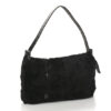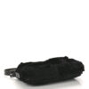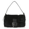 FENDI Rabbit Fur Baguette Black. This flap bag is made out of dyed rabbit fur in black. The bag features an adjustable black leather strap and a magnetic FF logo clasp on the front that opens to a silver satin fabric lining with a zippered pocket.