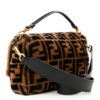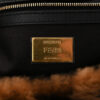 FENDI Shearling Vitello Dolce Macro FF 1974 Large Baguette in Tobacco and Black. This lovely shoulder bag is crafted of fine shearling wool in brown. The bag features a facing polished gold Fendi FF logo. This opens the front flap to a black jacquard and leather interior.