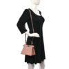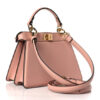 FENDI Shiny Nappa Petite Peekaboo I SEE U Satchel in Baby Pink. This chic tote is finely crafted of smooth padded calfskin leather in light pink. This mini-sized bag features gold squared turn locks on either side that when released, relax the outer layer to reveal the inner panel of pink leather with a gold metal bar. It can be carried as a shoulder bag with the optional adjustable shoulder strap or a tote by the top handle.