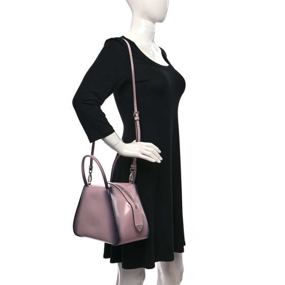PRADA Spazzolato Small Supernova Shoulder Bag in Alabastro Sfumato. This stylish bag is crafted of smooth calfskin leather. This bag features rolled top handles and an optional shoulder strap with silver hardware. The top double zipper opens to a matching leather interior with a patch pocket.