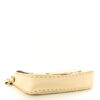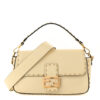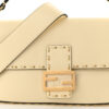 FENDI Vitello King Metal Stitch Baguette in Pergamena. This chic baguette is crafted of lambskin leather in white. The bag is features gold embellishments that resemble stitching. The bag features a white leather top handle and a matching, optional shoulder strap with polished gold hardware. The crossover flap opens with a prominent magnetic gold FF logo detail to a beige fabric interior with a zipper pocket.