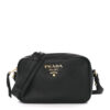 PRADA Vitello Phenix Camera Bag in Black. This stunning crossbody bag is finely crafted of textured black calfskin leather. The bag features a shoulder strap and an extra-long crossbody strap with gold hardware. The top zipper opens to a black Prada jacquard fabric interior.