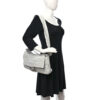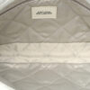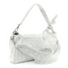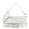 FENDI X MARC JACOBS Denim Logo Bleached Maxi Baguette in Off White. This chic baguette is crafted of fine white denim. The bag features a shoulder strap with silver hardware and a full frontal flap with a metal Fendi FF logo. This flap opens with a magnet to a quilted fabric interior with a zipper pocket.