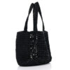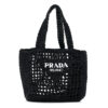 PRADA Yarn Raffia Effect Crochet Logo Embroidered Small Tote Bag in Black. This stylish crossbody is crafted of black raffia. The bag features a white Prada on the front and matching shoulder straps. The top opens to a matching spacious interior.