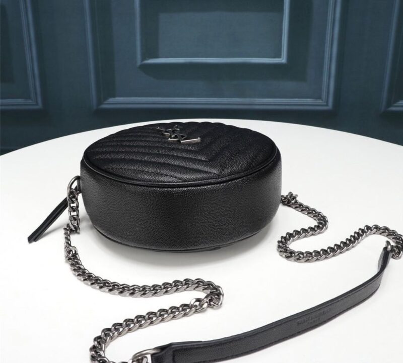 ROUND SHOULDER BAG DECORATED WITH CHEVRON QUILTED STITCHING AND METAL YSL INITIALS, CHARACTERIZED BY A LEATHER AND CHAIN SHOULDER STRAP.